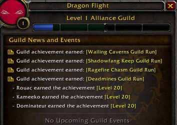 My guild may be incredibly small with only three active members, but we’ve not let that hold us back (so far). We’ve been doing our weekly guild runs to gain some experience and obtain the achievements. Thankfully we only need 3/5 group mates to be guild mates in order for it to count. For some reason earlier this week I had thought we needed 4/5 which we simply don’t have. Blizzards new guild level system is not very ‘small casual guild’ friendly, and encourages guilds to gain as many members as they possibly can in order to reach the achievements and weekly goals that they implemented. I know we’ll get there (“there” being anywhere above level 1 in this case) eventually, and it’s mostly due to our class levels (we’re currently 20-40 for the most part) that restricts how much guild experience we gain. I wish Blizzard took into consideration the number of accounts in a guild rather then assuming or encouraging everyone to belong to a giant one.