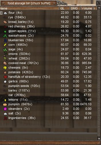 That screen shot above is the main reason why I have been spending my time between two servers, Deliverance, where my ‘home base’ is, and Independence, where I have a LOT of food stored up in a tiny little deed I own. I didn’t want to just leave it behind to rot, so last night I moved 2 characters back over to that deed so that my Vynora priest could work up his Hot Food Cooking skill. I mean, that’s a lot of food just sitting there.