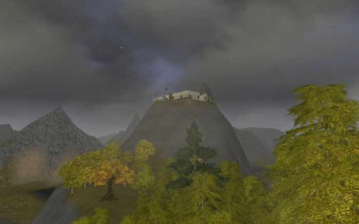 Pictured above, is Falkenstein Castle. I’ve managed to place a few flags (which I’m eventually going to dye, but at the moment I don’t have any access to dye components) and the outer walls are completed. Inside, things are moving along nicely. I’ve got a house started – it’s in an H formation, and is 13 tiles in total. This gives me a very nice 2×3 area for a ‘bedroom’ as well as another 2×3 area for crafting. I don’t need a lot of room as it’s just my Fo priest residing at the castle, so not a lot of crafting is going on.