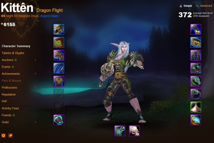 Once I hit 85 it was time to gear her up. What was the point with MOP just around the corner? Well, it’s just a personal preference of mine. Something I enjoy doing, too. So I took the lazy players method. I geared her up (to begin with) with player-crafted PvP gear, ilevel 377. My trinkets were holding me back from queuing for raids, but I was able to get into the heroic twilight dungeons. I purchased ilevel 397 wrist and feet (they’re sold for justice, and can be traded) and a cheap ilevel 359 weapon. I leveled up as feral but switched to balance and restoration even though I had never played a druid in a group or in either of those specs before.