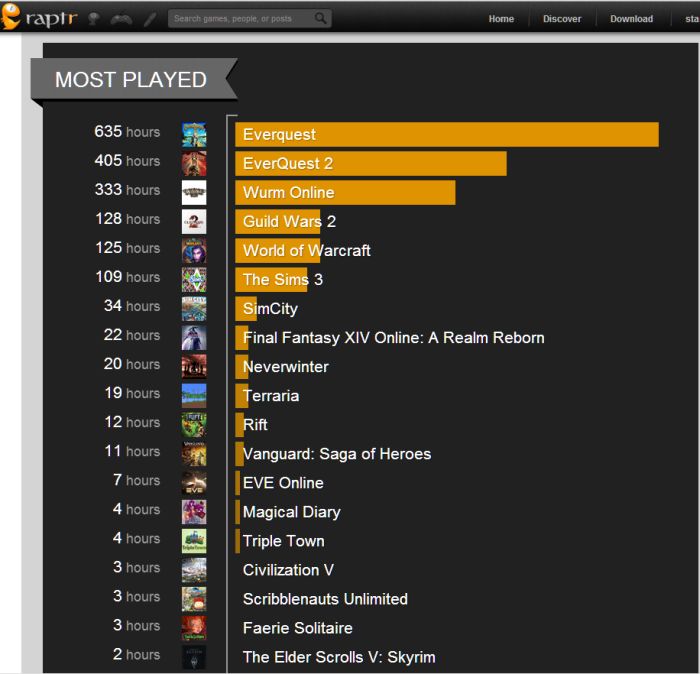 I’ve been using Raptr for years now, being a huge fan of lists and graphs. I started out first using xfire but that didn’t last, and raptr does a good job at what I want it to do. Plus you can earn some neat rewards. Anyhow, they sent me an email about my 2013 gaming year. I was pretty heavily into EverQuest in 2013 (that’s the original) so it’s no surprise that it makes the top of my list followed by EverQuest 2. A few things to keep in mind – this is not 100% accurate, there are times I don’t bother loading raptr and thus it doesn’t track. There are times the game isn’t recognized and I have to track by hand – like Wurm Online. Even though it actually shows as my 3rd most played game, I had to manually track those hours. If you take into account the time I left my characters online, it was probably my 2nd most played game, maybe even my first.