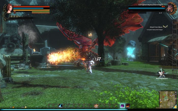 I installed it throughout the day and logged in tonight to make my way through the tutorial and learn the keyboard controls. Of course the first thing I really wanted to do was learn how to hide the UI (it’s F7) and take screenshots (uncomplicated, it’s PrtScr). Things so far are easy. Left and right mouse button are my current two attacks, and they can also set off combos. I do own two dragons from previous claims, but I have no idea how to use them or what they’re even for, so for now I am just keeping them in my bags. I also got a title, and a cloak. I discovered the game has achievements, something else that I had no idea about.