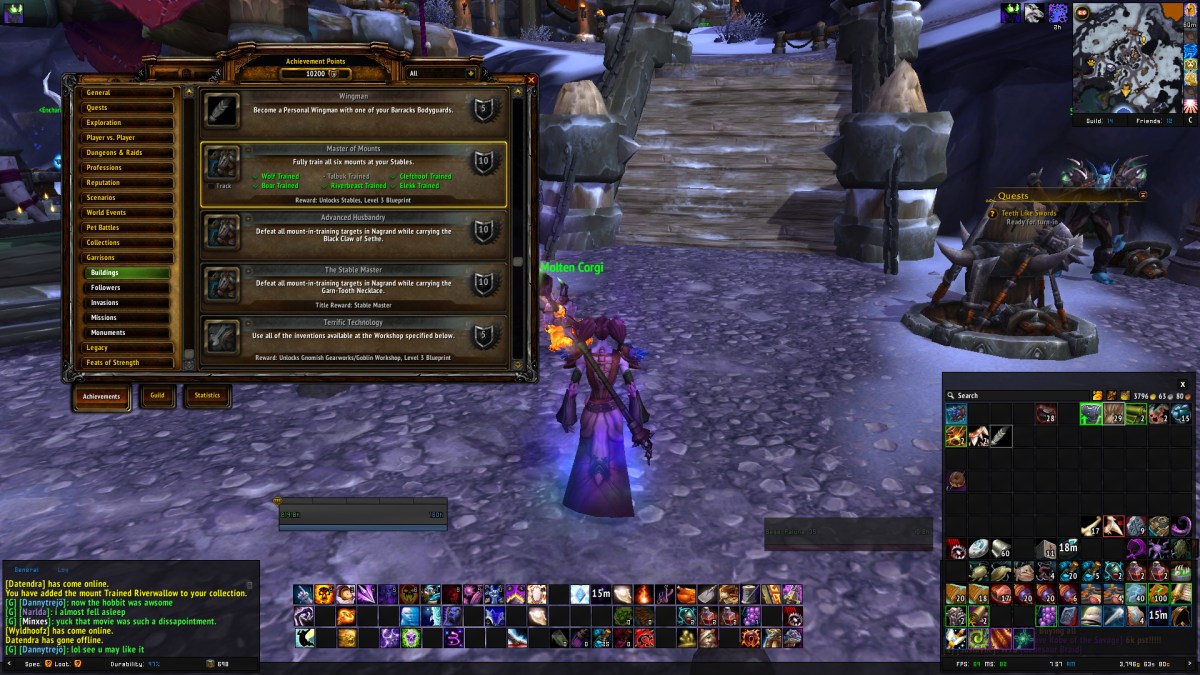 I’m still having a lot of fun in World of Warcraft, but I’m finding it difficult to focus and decide what I want to work on. There’s still just so much to do. I enjoy working on achievements, but I also enjoy running dungeons and raiding. Then there’s my garrison, and working the menagerie and my fishing shack to level 3. Then there’s crafting, I still need 15 points in tailoring to reach 700. That’s just my main character, I still don’t even have any other characters at level 100 yet, and I have a lot of them (im)patiently waiting at level 90 for a bit of action.