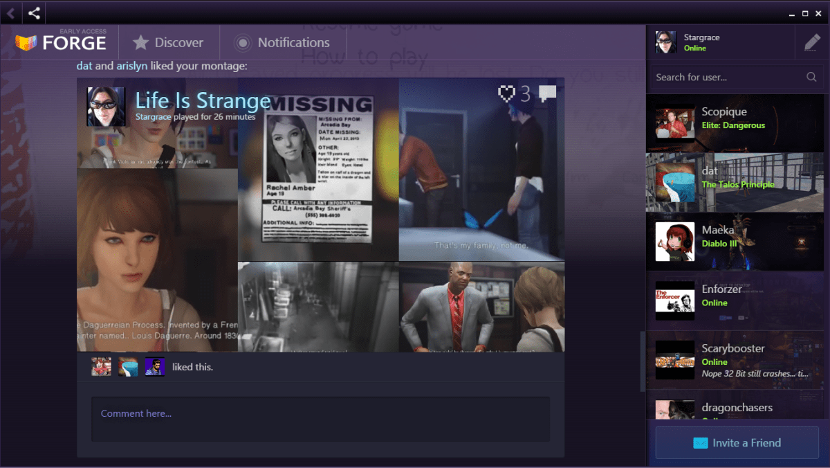I love that I don’t have to do anything in order to broadcast except start Forge. It collects snapshots and allows you to post short (30 second) clips about your game play session, and it’s mostly to watch ‘live’. It tweets out when your broadcast starts a few minutes in so that if there are issues with you disconnecting you’re not spamming your twitter followers. Have I mentioned how much I love the UI? Let me say that a few more times. It’s probably the number one feature that I adore. After two days any videos you have are purged, leaving behind the 30 second clips, screenshots, and montages. You can find my profile here, if you’re looking to follow – if you’re looking for an invite, let me know and I can send you one (need to know your email address).