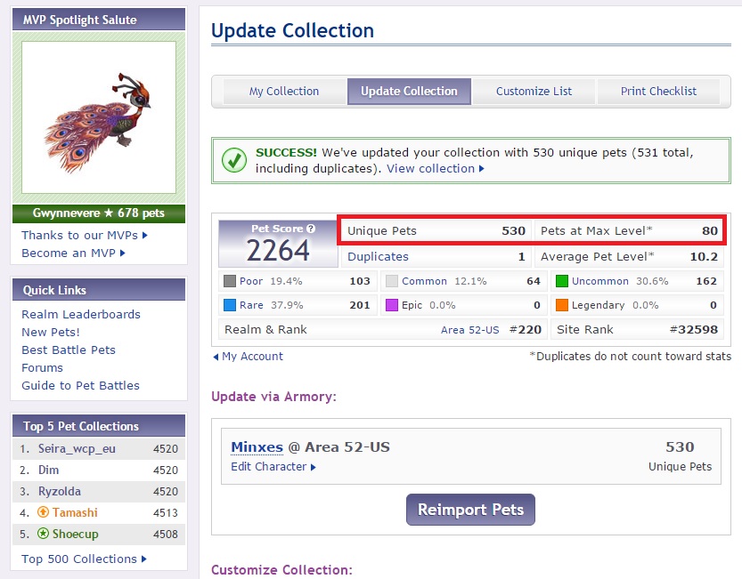 This weekend I finally completed the 150 Draenor pet battles required to purchase the T3 pet home for my garrison. I had been procrastinating for quite some time, for whatever reason. Probably because I was just burned out. I updated my pet collection this morning and that brings me to 530 unique pets, 80 of those are level 25. I still have a long way to go in terms of leveling and in terms of pet quality. Now that I have a few characters at level 100 it makes things a bit easier as they can each do the garrison dailies, but of course then there’s the chance that I’ll burn out and just stop all together. Thanks to the Pet Battle Teams addon from Curse I just create a team for every fight, and it makes things much smoother. I don’t have to guess at who I need to use to defeat the team of the day.