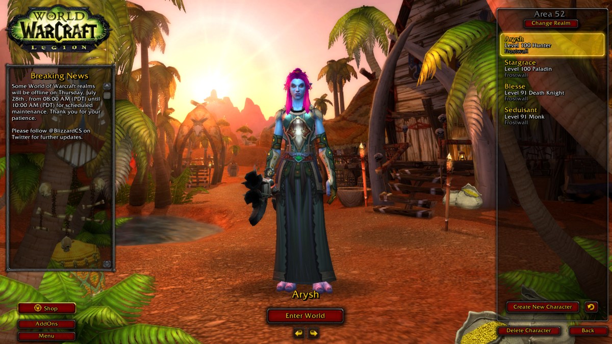 I try to keep my characters all on two realms, I have horde over on Area 52, and alliance over on Argent Dawn. After playing around with my alliance priest and getting raids done yesterday, I decided to swap over to my horde character and try out the hunter. First though I played with the shaman. Not a fan of the new melee changes. Then I played with my warlock, choosing demonology since that was the entire reason I created a warlock to begin with. Nope. Just not a fan. The class plays very “slow” at level 94, and I just wasn’t feeling it. I’ll have to take another day to try out the other warlock specs, it seems like Blizzard is really keen on people playing a brand new spec outside of their comfort zones. Not a bad thing per say, it’s just different. In fact so far none of my characters have kept their “main” specs from before the Legion Pre-Patch.