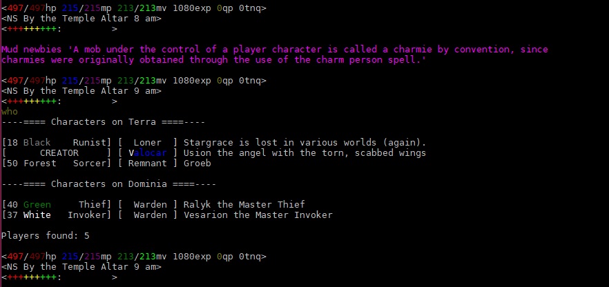 I’m also not part of a clan yet, which is why my character is marked as a loner. I know nothing about the current clans aside from what I’ve read in help. Warden has basically nothing, Remnant has a bit more information and sounds more my style. I’ll have to look into whether or not there are others. I don’t think I’ve seen anything else.