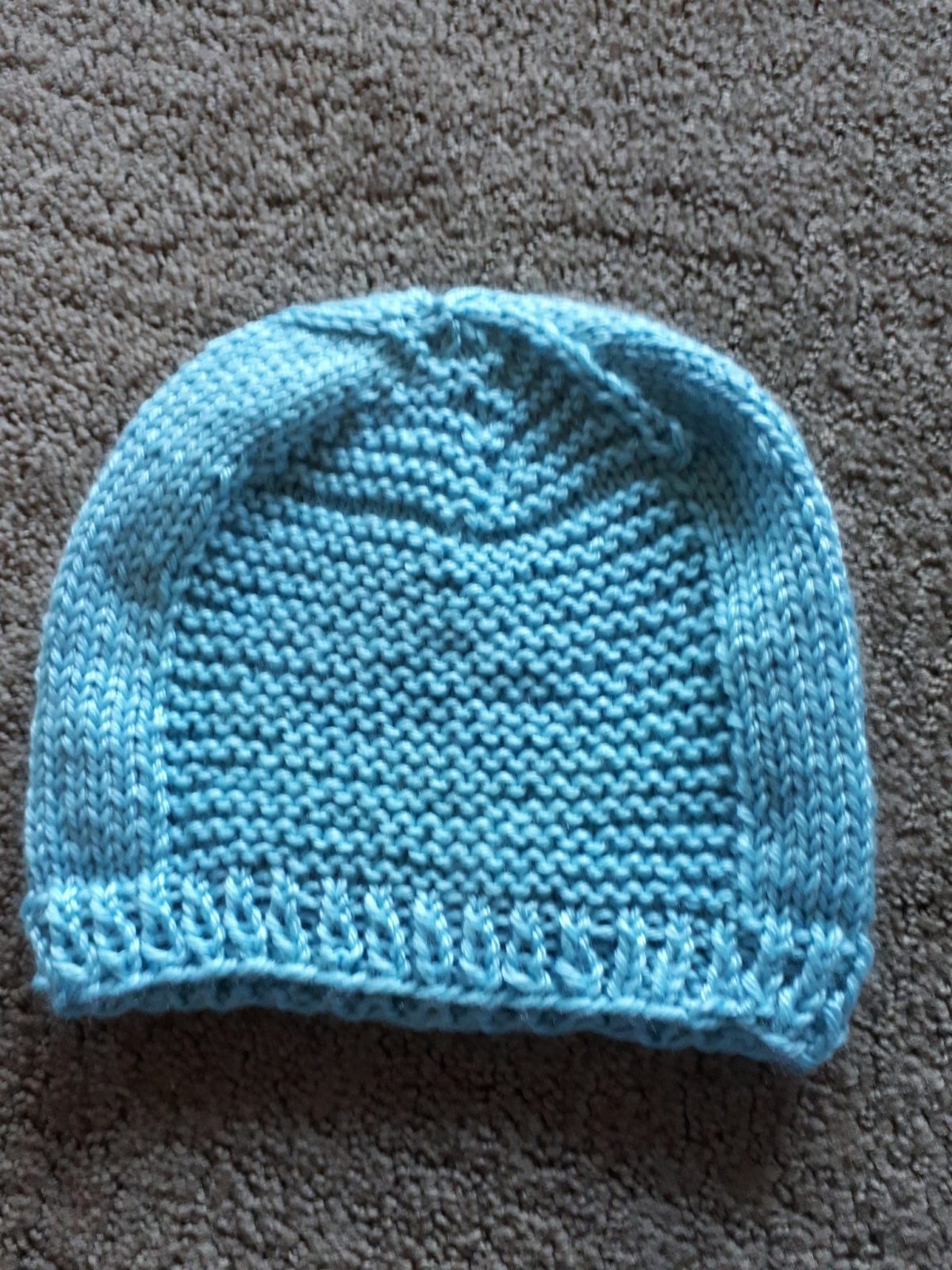 There’s an issue with the pattern before the decreases. You end on a knit row and continue with another knit row to establish the decreases when you should end on a purl row. That’s the weird wonky line at the top before the hat starts to curve. It doesn’t affect the warmth of the item at all and it’s something my kid certainly won’t care about so I decided to just leave it be and finish knitting it. It’s made from an extra soft acrylic yarn from KnitPicks called Might Stitch. The hat is (of course) too big for him but I figure he’ll grow into it. Hopefully not too quickly.