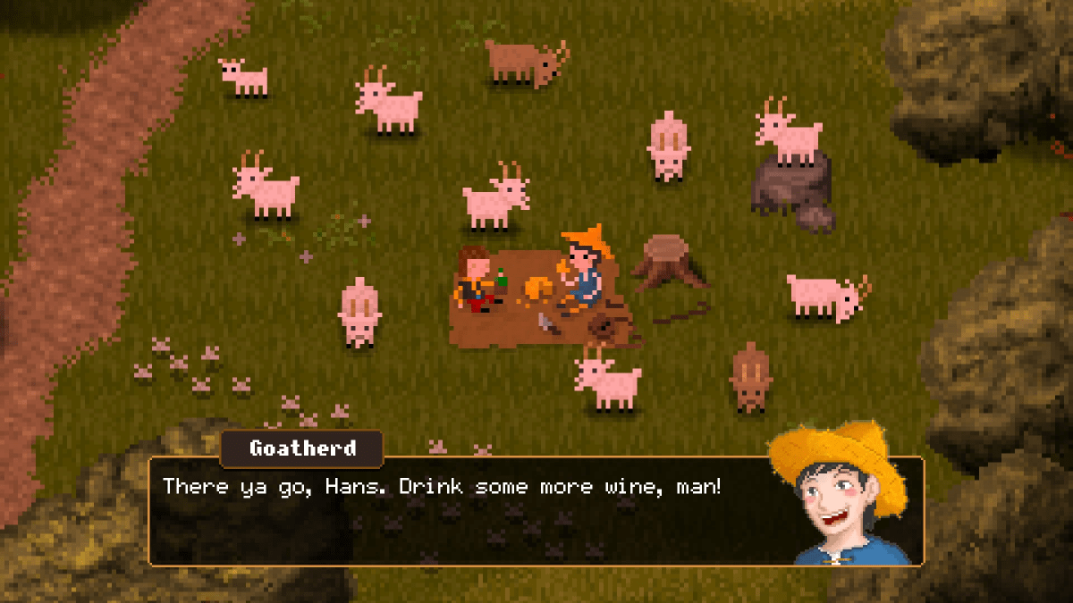 Walking even further, Hans spotted a shepherd with his goats. The shepherd was hungry, so Hans offered to give up some of his cheese. The shepherd said he had some wine he could give Hans in exchange, so they had a lovely picnic together – until Hans passed out from too much wine.