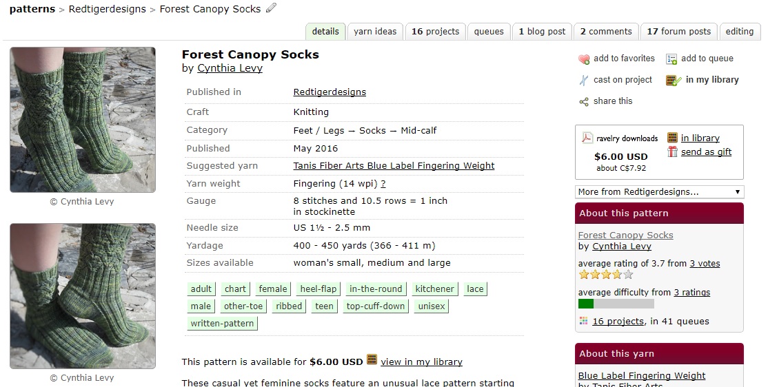 I spent most of my free time yesterday evening on Ravelry, looking through the 300+ designers who are participating this year in the indie design gift-a-long and hunting for the perfect sock pattern. Eventually I stumbled onto ‘Forest Canopy Socks‘ by Cynthia Levy, a [pattern that looked beautiful due to the lace and ribbing, but not too complicated so that it would be beyond my skills. I’ve only been knitting for two years, and this sock really has a nice wow factor without being something that I think would confuse me too much.
