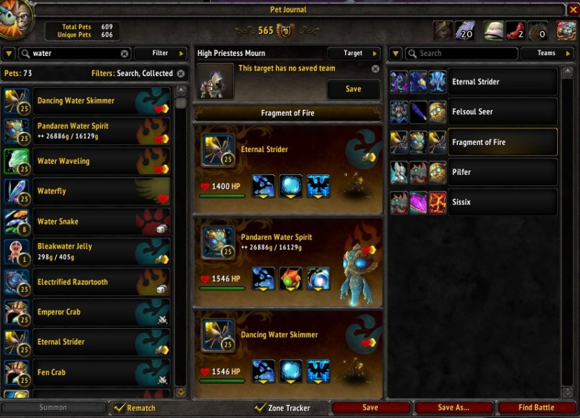 I haven’t done a lot of pet collecting in Legion, I haven’t been through the zones to see what I’m missing, and I haven’t seen where I get the pets I’m lacking. Lately the mod I’ve been using the most, is Rematch. It lets me make teams which a few other mods let me do, but in this case I’m able to create it based on the NPC that I’m targeting. As you can see by the far right hand side I’ve got 4 Legion NPCs listed there, the ‘eternal strider’ one is just a leveling team that I threw together. Some of the battles are more difficult than others and I still need to look up the method that I defeated them the last time, but in most cases it’s pretty straight forward. Attack until the NPC pets are dead.