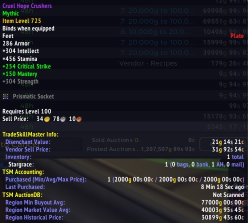 What have I been doing? Well, I watched some videos on YouTube first, and set up groups in TSM to do specific operations like undercut based on a %, or price at a % depending on what the market value is. The blizzard api has been down since 7.3.5 so prices are skewed right now and are not working optimally, but it’s still teaching me and it’s not too bad.