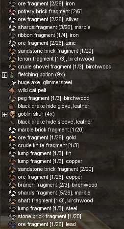 I think this is a case of a great idea that was implemented poorly. I spent a few hours roaming around looking for fragments, then a few more hours identifying all of those fragments (you use different tools depending on the stage the fragment is at) and then more time attaching fragments together so that I could create – welp. Not much of anything. By the screenshot above you can see I have some ribbons, bricks, branches, pegs, and other bits and pieces like ore. The thing is, after spending a few hours hunting down the components to make a lump of tin, I could have taken 10 seconds and just gone and mined the same thing from my deed.