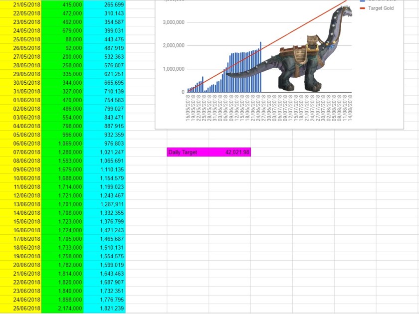 I started off tracking my gold May 16th and I had a total of 176,000. Not a very impressive number by any means. Now, June 26th, I’m at 2,174,000 and I’ve crossed over into the 2 million gold mark. I’m still quite far away from my desired goal of 4 million, but I have been keeping above where I need to be just slightly. Again this will probably take a nosedive in a few short weeks because I’m due with my second baby, but it has still been a fun adventure so far.