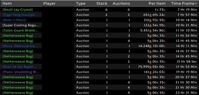 Netherweave bags are a big seller in multiples for me, but the cash doesn’t add up to too much. Elixir of the Rapid Mind is a nice seller, and I only see this going up. I’ve started stocking up on some inscription items, we’ll see how that goes.