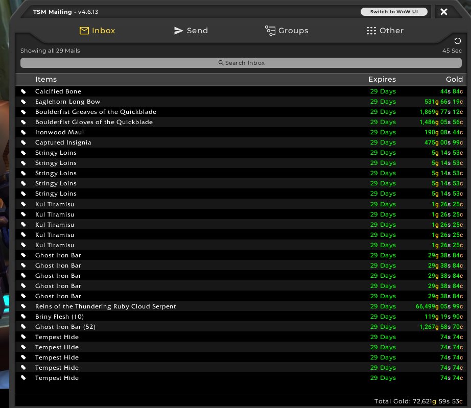 So far crafted goods are still doing pretty well, especially BFA craft materials. The problem is I actually need to log in and farm said materials in order to sell them, or find some items to flip.