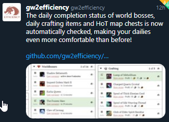 This one little change to a quality of life thing has become so very handy and I couldn’t be more tickled that they added it. GW2efficiency is a site that allows you to track all sorts of useful information about your characters across your account thanks to the GW2 API key. Now I have a reminder about doing daily crafting and world bosses, for those days where I am not sure what I want to get done.