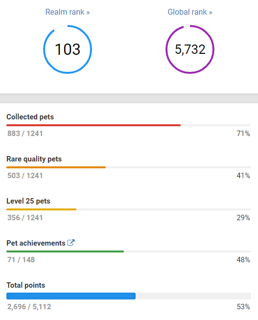 I’ve been working on my pet collection – slowly. Leveling up the ones that are not 25 yet (I have a LOT of those) working on achievements, doing dailies, dungeons, and all that fun. I managed to do the celestial tournament without too much hassle, and next week I should be able to purchase my 2nd pet from there. Otherwise, I’ve just been watching the market and picking up anything that is 50% lower than normal market dictates