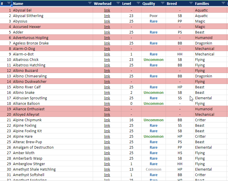 I use the same tactics for blogging. I don’t pre-determine what I’m going to write about but I do jot down ideas, rough schedules, save up screenshots for future posts, and all of that good stuff. It helps me feel in control, gives me some semblance of organization in a world where I have very little of it. Charts and graphs and lists actually help calm me down, which is why I’m pretty devoted to my bulletjournal, or importing excel sheets like the one above of my world of warcraft battle pets.
