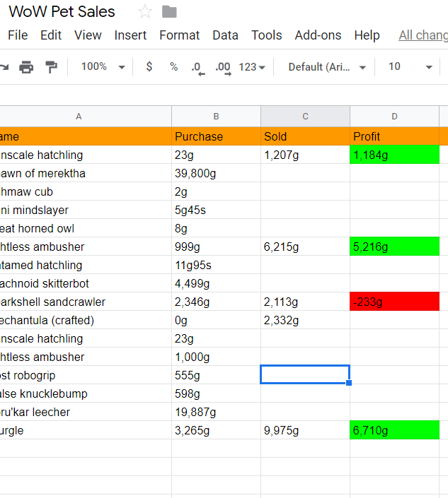 Since TSM won’t keep track of my stats across server (ie: I purchase a pet and transfer it, I lose the info on how much I purchased it for when I am on the other server) I’ve been tracking it in a simple google doc instead. I don’t need to know much information, I just want to know what I purchased the pet for, how much I sold it for, and what my profit is. After two days, keeping track is pretty good. It doesn’t take much time, and I’m looking forward to paying attention to any trends I notice. As always, happy gaming, no matter where you find yourself!
