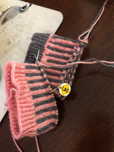 While technically I am knitting them two at a time, I’m using two 9″ circulars, my needles of choice. I’m making the pattern up as I go along, but I think they’ll be fraternal pairs, and short ankle type socks. We’ll just have to see!