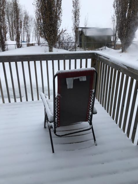 But today is just not that day. There’s still over four feet of snow in the backyard, and we got a fresh storm this AM that took care of the lovely chair I placed out on our once clear deck.