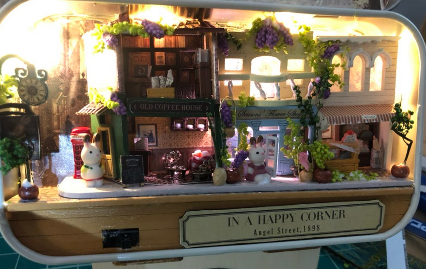 There’s just a little bit of work left to be done on my Happy Corner miniature kit! It’s so tiny, and I’ve really enjoyed the process. I set up the wiring and everything works!