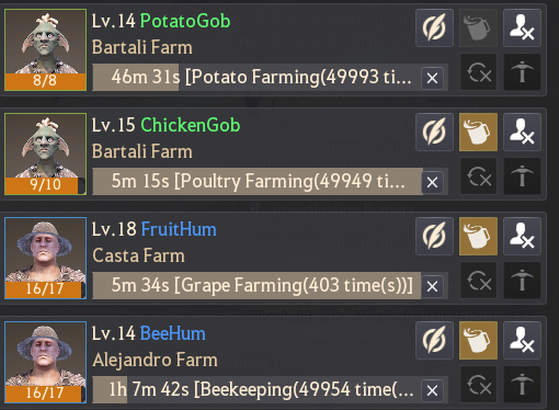 When it comes to hiring workers to do chores for you, there are three you can choose from. Giant, human, and goblin. Goblins work the fastest, but they also are the weakest and they require a lot of food upkeep. Not great for overnight crafting/harvesting sessions. Giants have a lot of strength, but they’re also the slowest. I found them far too slow for my node harvesting endevours. Humans are between the two, and they’re a pretty good balance for my game play style. Every 10 levels when they’re done working you can attempt a promotion, so right now for 24 hours PotatoGob is working on a promotion test. He can fail this test, but if he passes his name will turn blue like the other two at the bottom of the list who are ‘skilled’ workers.