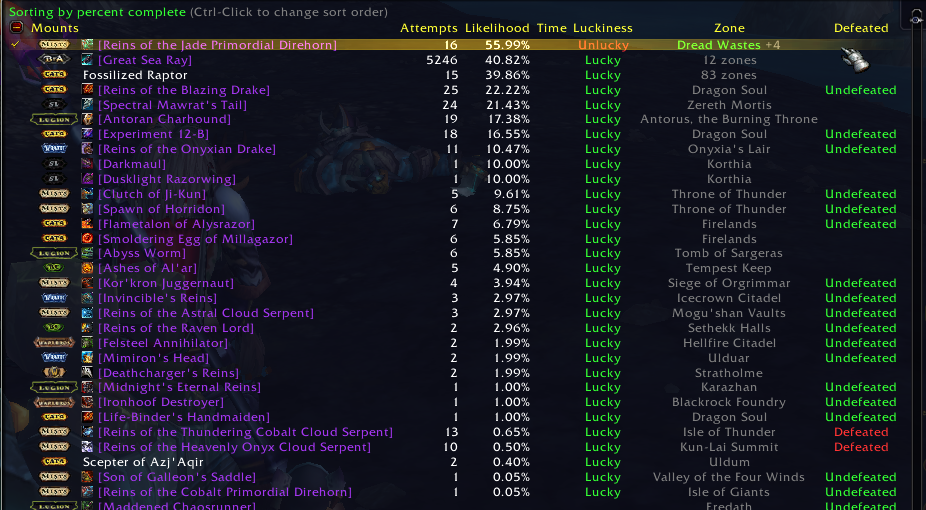 I’m using the addon Rarity to track my mount attempts, and I have officially swapped over to ‘unlucky’ when it comes to getting the jade primordial direhorn mount. This comes from Warbringers in Pandaria zones, and I’ve already obtained the Amber and Slate ones, but the Jade one is a whole different beast.