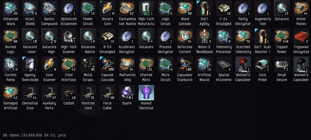 Exploration is one of my favourite things in EVE – it’s not the only thing I enjoy, but it makes up a huge portion. Hacking & data sites are a part of that, and some days I have a big payoff (like the one above, it took me maybe 20 minutes) and other days it’s much quieter. I think that’s one of the reasons I like it – I never quite know what I’m going to be in store for. Yesterday was one of the best ISK runs I had done – in less than an hour I had looted over 180M ISK worth of items, all from a single C2 WH that I stumbled into – YAY!