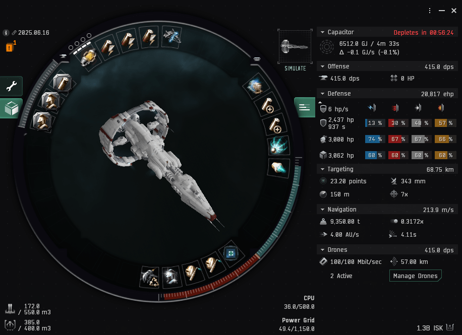 I’m using the fit above for light combat, I have a bunch of drones in the bay, and I swap out the web for a data/relic analyzer when needed. Of course that also means I’m carrying around a mobile depot, I’m also carrying around a mobile tractor unit, salvager, and some nanite repair paste. This is roughly 30% of my cargo space, which is perfect. I have max drone skills and I don’t have to worry about ammo.