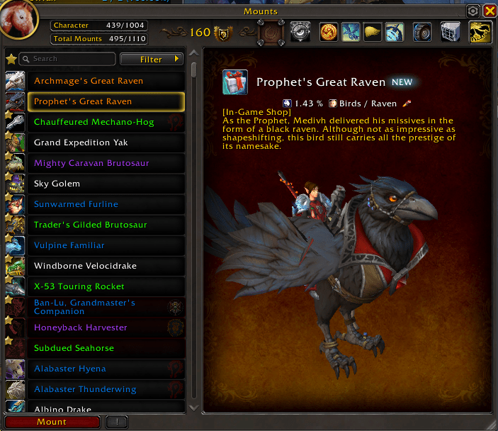 I decided to splurge a bit and purchased the raven mount pack that was for sale in the bnet shop, since I had converted a bunch of tokens into balance earlier this week. That brings me up to 495 mounts total, and I really just love the way the raven looks. I used to feed a pair of ravens at our post up North, nothing but good things to say about them.
