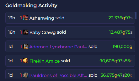 I expect that sales will pop back up slightly once remix is done (just a few hours from this post) and I finally shuffle the rest of my auction house characters around. There are a good number who have been in limbo since remix began, and I’m looking forward to getting a bit of continuity going again as far as gold making goes.