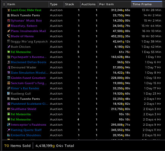 In any case, it’s nice to see some higher sales. Today I did not put items back up for sale, instead I let them expire and I’ll get to them tomorrow morning. While I do try to remain mostly consistent, it doesn’t always end up that way. I prefer to do my auction house posting first thing in the morning, so if something else has my attention at that time, I tend to just leave things be until the next morning that I can get to them – and that’s OK.