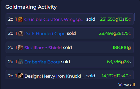 As you can see my sales were all over the place, a few recipes, some transmog. Nothing important of note. I imagine I’m selling to a lot of other goblins who are hoping to make a profit, or maybe the odd collector here and there. Still, 2 million gold is at least some gains, and next week is a new week.