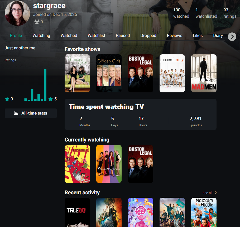 So I stumbled into a discord conversation about this exact thing, and someone mentioned a website called ‘Serializd’ (which I believe is a TV series version of Letterboxd). I signed up, and spent an evening browsing through my netflix/crave histories attempting to remember shows that I’ve seen over the years. I love tracking statistics, and I really like the minimalistic view of this one, for now at least. Whether or not I keep up the tracking, we’ll just have to see. I also wish that both movies & tv were tracked together, but I imagine that’s a whole other ballgame to handle.