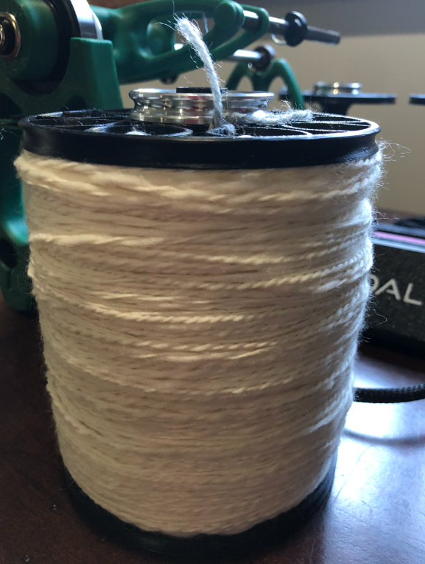 In a single evening I managed to finish spinning the singles of the alpaca, merino, & finn fiber that I had. It was 3.5oz, which on my kiwi would have taken me a few weeks, at best. The fiber wasn’t the easiest to draft (as I already mentioned) and was quite filled with neps, but I’m hoping to learn how to chain ply using it. Chain plying is perfect for when you want to keep colours together, or for when you don’t have 2-3 bobbins of yarn to ply it with. In this case, I only have the one bobbin. I’ve never tried chain plying before, but it has been on my to-learn list for a number of years. It’s just a nice skill to have. I think using my Starling will be a good way to learn, I can keep the speed very low, and I can forcus on the hand motions required rather than focusing on my treadling. Hopefully the next update on this yarn will be the completed version.