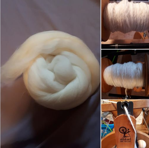 The staple length is quite long, but the fiber is VERY slippery. I’m spinning it pretty thin, hoping for a fingering weight once it’s finished. I have 4oz total, so I split it into 2oz sections, and then split those sections just slightly to ease my spinning because this fiber sheds unlike any fiber I’ve ever used before. The first day I tried spinning it I felt like I owned a white long haired cat, I was completely covered from head to toe. Now I spin this stuff on the balcony, otherwise it gets EVERYWHERE. Somehow it even managed to get around my kids sippy cup.