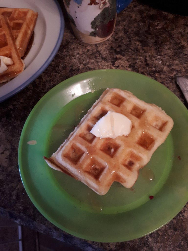 They were pretty good. A bit thicker than I am used to (I’ve never had fresh waffles before, only frozen, so lets be honest here I have nothing to compare them to) but they seemed to turn out pretty well and they were really simple to make. I’d like to try my hand at some savory ones too, eventually. Have waffle recipes you want to share? Let me know in comments.
