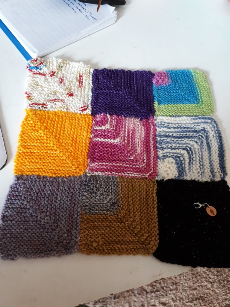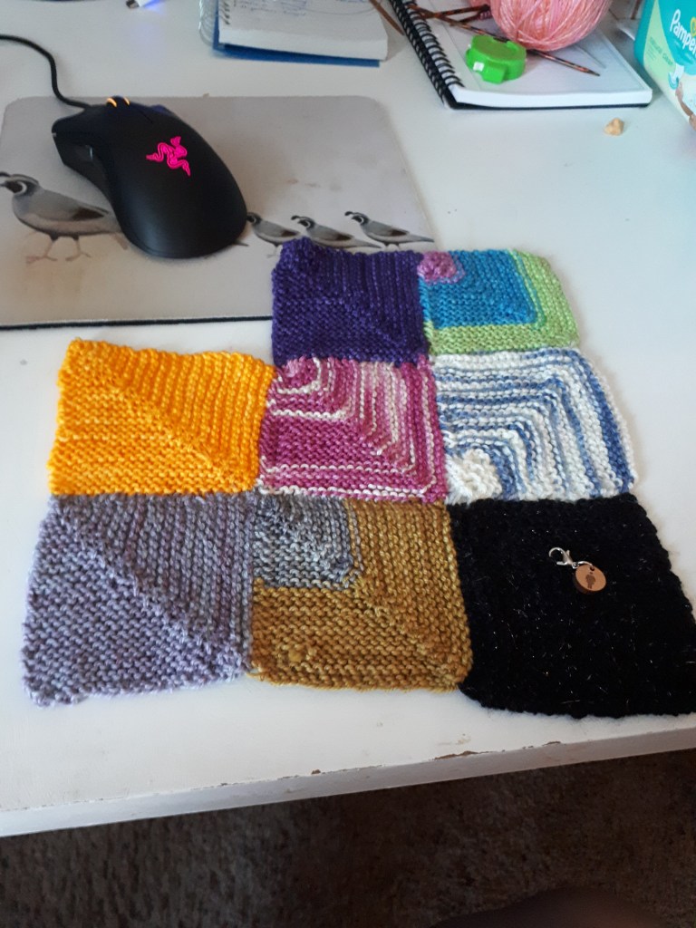 For today I’m starting off with a square on my mitered memory blanket. I’m up to 7 now and it’s starting to feel more like a piece of cloth rather than just weird squares of yarn. It’s soft and squishy, and as I knit it I imagine Llama Bean or Nugette taking it to college with them to keep warm and remind them of home. It doesn’t LOOK like much right now, it will require blocking and a boarder (and to be much larger, of course) but I can see it in my mind. Each square tells a story. Not all of the yarn came from my stash, either. A lot was donated through a christmas exchange (if you’ve got spare fingering yarn you want to donate it takes less than 25 grams to make a square, just drop me a message here or on twitter and we can see about an exchange!) that I’m very grateful for. Some squares tell my story of learning to knit socks, staying up late working on baby clothes, or just trying to de-stress from the day. Other squares tell the stories from other people. That’s what I love about projects like this. Plus you can never have too many home made blankets…