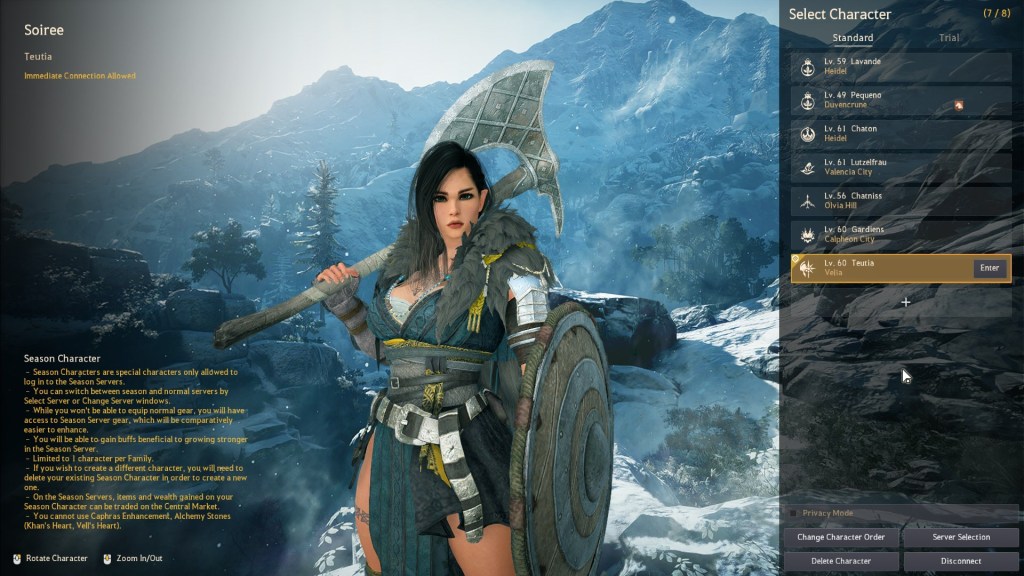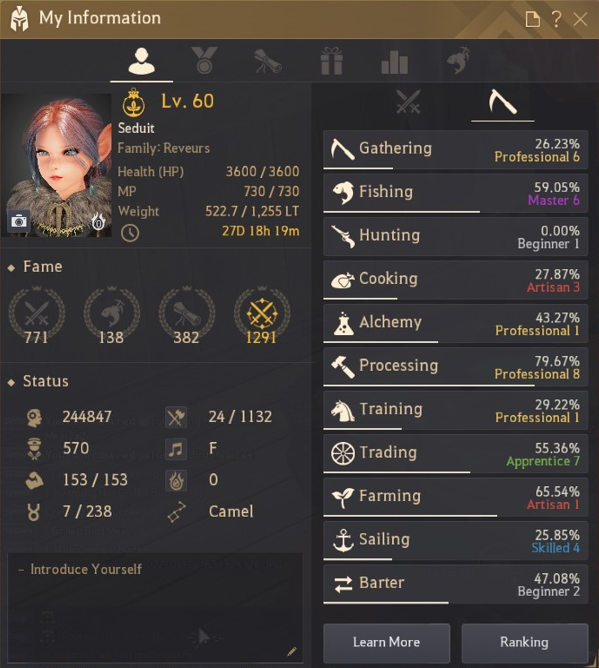 First, I created a Dosa, my first male character (my one issue with BDO is that classes are still restricted by gender). I made a season character – but seasons have changed now, they’re no longer static dates that rotate, you can create one when ever. I had a scholar in the works (the newly released class before Dosa) but decided that I didn’t want to continue with that, for now. Anyway, apparently life skills are now family (account) wide! That was one of the first changes I noticed. This is a fantastic change, I used to swap characters all of the time and I’m very glad it went account wide. On that same note, harvesting tools are also now shared across your family, another VERY delightful change.