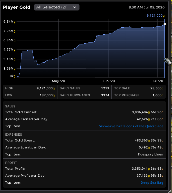 I can’t say I’ve been playing very steadily, but I AM enjoying watching the graph go up (it will take a few dips, I need to pay for some accounts coming up). My goal is to hit gold cap on one character before Shadowlands comes out. Why? No real reason, it’s just a goal I set for myself. Will I obtain it? I’m honestly not sure. I’ve been swaying to and from gaming lately, I’ve not been feeling the greatest and I’m pretty tired some days so I end up staring into space not doing much of anything. Hopefully it’s just the heat and summer that has me down.