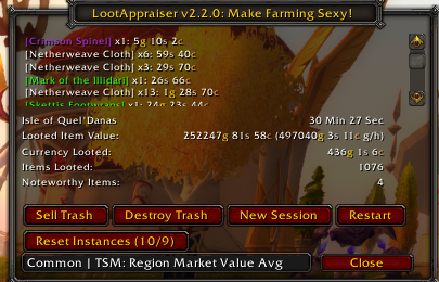 Last week I did my first 10 runs of Sunwell Plateau, and LootAppraiser told me I had a looted item value of 122091g in 30 minutes. This week I ran another 10 dungeons, and LA gave me 252,247g in valued items. In actuality, with sales, I’ve earned 436g (that’s the raw gold from this week) plus 7,757g (that’s how much everything sold for this week) plus the 483g in raw gold from last week. That brings me to a total of estimated looted: 374,338g in 1h of farming. Actual gold earned with raw + sales: 8,676g. Now, earning 8,676g in an hour of farming isn’t exactly THAT bad, but it sure isn’t that great, either – and it’s a far cry from what LootAppraiser claims I’ve made. The plus side is that I do also have a lot of stock – and that has value even though it hasn’t sold yet. Right now my stock value is: