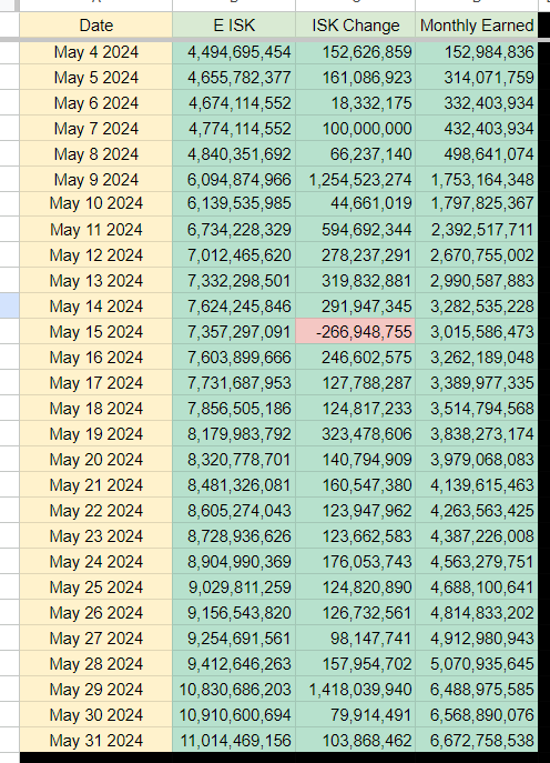 I figured I might as well do an economy round up for my ISK earnings in May – these will be slightly higher than my ISK earnings in upcoming months because I had some big time collateral that I sold. I sold a spare Orca (and instead bought a porpoise), sold my tengu (and then bought it back at the end of the month, when will I learn), and bought two Ishtar after getting them blown up (next one I’m building myself, not sure how/why but I have a BPC for it so I might as well).