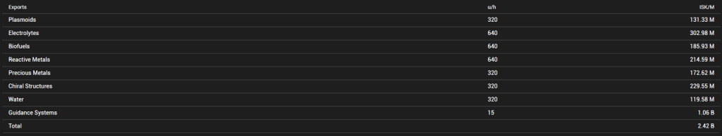 Right now I only have 2/6 characters doing PI steadily. I’m extracting P0 and turning it into P1, and I would usually then take it and turn that into P2 (robotics & guidance systems) but I’ve been trying to get things sorted so I’ve let it lapse for now while I figure things out. I use a wormlife freeport for the 4.5% taxes, and every Monday I collect my PI and then when it’s quiet I’ll scan down the HS connection and drop it off. My PI characters are not very fancy, but they are Omega, and they can fly ships with cloaks, which is nice. It’s not mountains of ISK each week, but it is pretty passive, sells well, and is very minimal effort. I don’t mind logging in to re-set my extractors each day, and collecting PI once a week works out well. I could attempt to collect it less frequently, but the Epithal I’m flying fills up quickly and I don’t want to make more trips than I have to.
