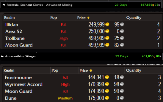 Transmog and pets made the bulk of my sales, with recipes coming in third. I’ll have to go through and restock, today I opted to take a break from posting daily and I’ll pick it back up tomorrow. A break here and there is never a bad thing, sometimes my mornings are a bit busy and I don’t have the 1h available. In any case, I’m still pretty happy with these sales.
