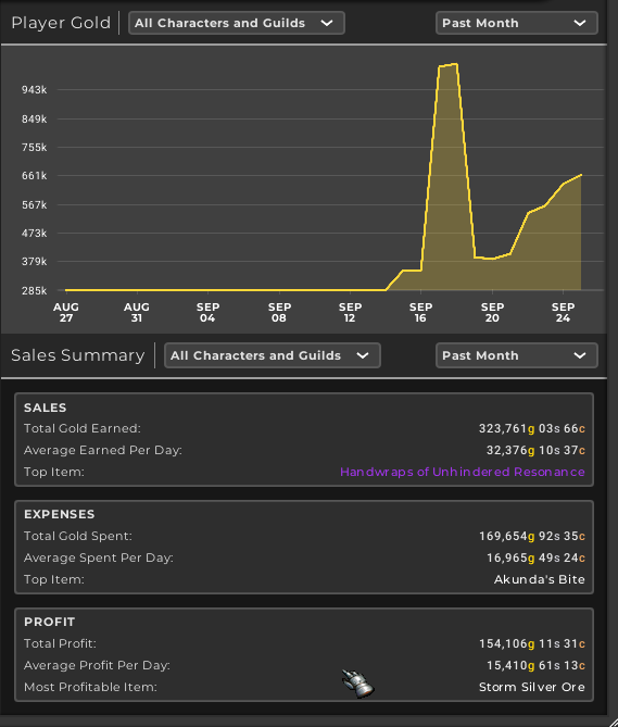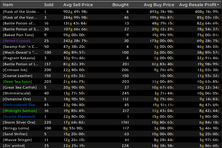 That being said, there IS money to be made. It’s only by branching out that I get to discover this. Posted above is my most recent sales and flips. Items I purchased for one price and then sold for a higher price. When the market is flooded the price dives down, but on days where the items are used in a quest they tend to go way up. You can see my largest profit was from reselling a flask of the undertow that I purchased for 499g and then sold for 902g – but I only sold one out of the 4 I bought so far. Bigger sales but smaller profits include ink, battle potion of intellect, leather, and silk. These are not consumables, but are still money in the bank.