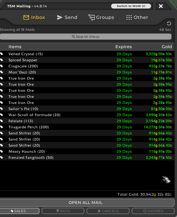 TSM also replaces the crafting window with a lot of incredibly useful information, like who you need to log to next to make use of their cool down crafts, and who has what in their bags for crafting. You can also queue crafting, and it will direct you on who to log on. You can also see what craft items are selling, and for how much. Like I said, there’s a TON to this addon, and it’s completely worth learning.
