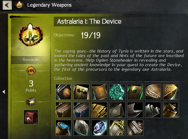 Thanks to my amazing guild mates PixelOne, Cheyenne, Ironwolf, and Ogur, after a few fractal runs yesterday I am done the first step in obtaining my legendary weapon, Astralaria. Next I need to craft The Device, and then I can move on to part II. For this I need to do a few daily crafts (globs, mostly) and I’m trying to harvest as many components as I can to cut down costs. Most of what I need is iron ore, which conveniently has some static rich nodes that I can harvest each day. I do also need a lot of rugged leather, which I’m finding more difficult to obtain, and I may end up purchasing instead.