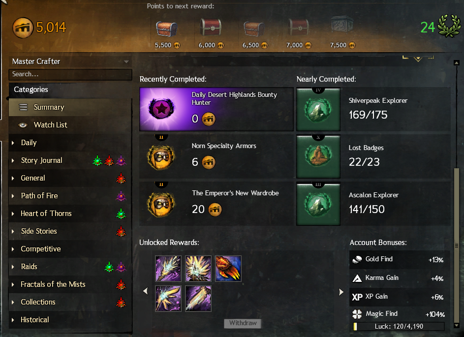 It may have taken over 6 years, but I finally reached 5,000 achievement points in Guild Wars 2 – and I’m really proud and happy that I did. It rewarded me with a ton of stuff, including 400 gems, a new skin unlocked, 15 gold, some laurels, a title, and more. For my final few points I ended up running around the starter cities purchasing the cultural T1/T2 armour to unlock some fashion achievements. As Pixel_One is always saying, end game in GW2 is Fashion Wars – and it’s completely true.